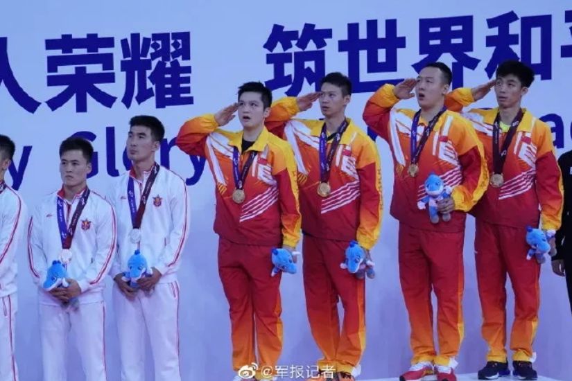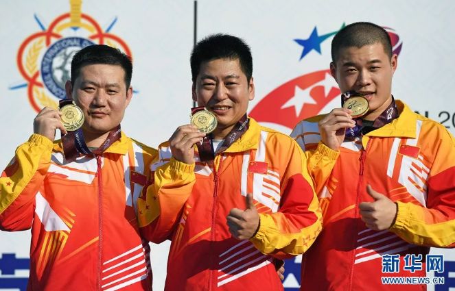 19日,男子25米手枪军事速射团体比赛中,中国队夺得冠军。这是中国代表团,在本届军运会上的首枚金牌。
