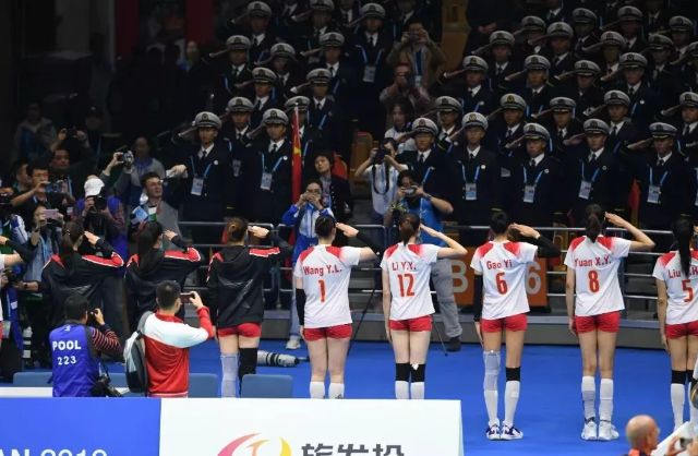 期间,观众席上的兵哥哥们忽然集体起立齐唱起军歌,为女排加油。