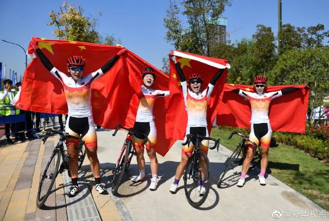 △20日,在公路自行车女子公路团体决赛中,中国队以4小时05分46秒的成绩获得金牌。