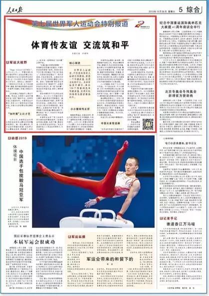 《人民日报》今天第5版刊登题为《体育传友谊 交流筑和平》的文章,聚焦第七届世界军人运动会,不仅是各国军人运动员的赛场,更是一个传递友谊、交流文化的平台。