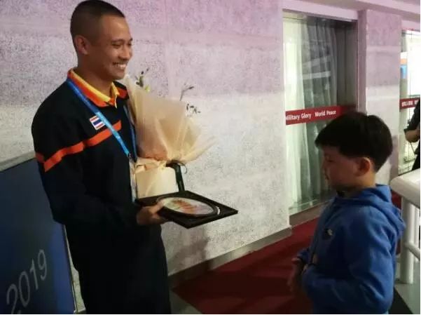 拳击赛场的看台上,7岁的小观众习梓洋与身旁的泰国代表团成员洛本交谈,并祝愿泰国选手获得比赛胜利。泰国选手获胜后,兴奋的洛本送给这名小观众一枚徽章。两天后,习梓洋又回赠给洛本有着武汉黄鹤楼图案的刺绣。双方约定,今后要在曼谷再见。