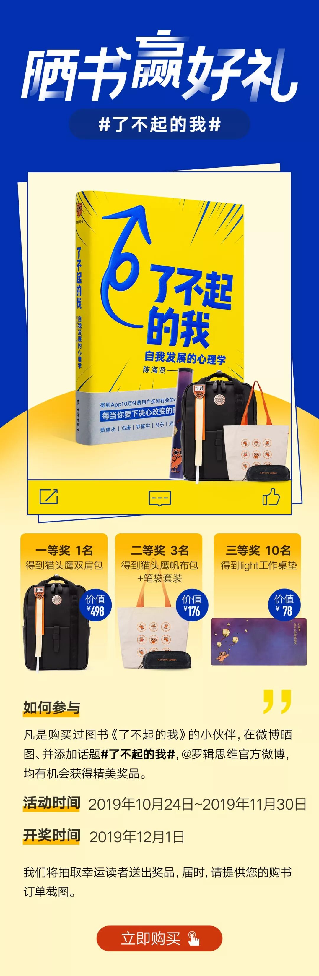 即日至11月30日,凡是购买新书《了不起的我》的读者,去微博晒图,添加话题#了不起的我#,并@罗辑思维官方微博,就有机会获得最高价值498元的奖品。