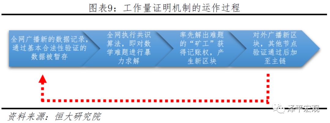 工作量证明机制的基本步骤如下:1)节点监听全网数据记录,通过基本合法性验证的数据记录将进行暂存;2)节点消耗自身算力尝试不同的随机数(nonce),进行指定的哈希计算,并不断重复该过程直到找到合理的随机数,这一过程也被称为“挖矿”;3)找到合理的随机数后,生成区块信息(块头+块身);4)节点对外部广播出新产生的区块,其他节点验证通过后,连接至区块链中,主链高度加一,然后所有节点切换至新区块后继续进行下一轮挖矿。