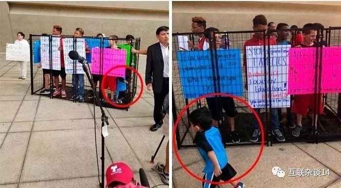 真实的情况却是在模拟一个抗议现场,这些孩子根本没有被锁起来,这个小男孩轻轻一推门,就可以走出来。