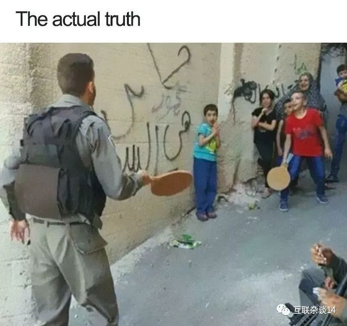 一个士兵手拿球拍想和当地的孩子一起玩耍,但是孩子的眼里充满了惊恐和抗拒...
