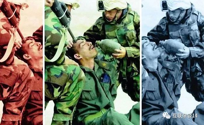 在这张图片上,两个美国大兵正在喂一个战俘喝水,如果把右边裁剪去,这个图片的意思就是美国大兵端着枪对着战俘;如果把左边裁剪去,图片的意思就变成美国大兵扶着战俘,喂他喝水。