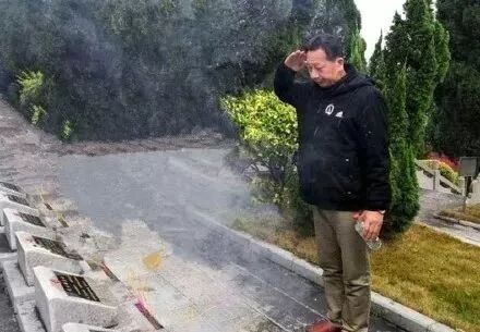 何源海在烈士陵园自己的墓碑前,向“牺牲”了的何源海敬礼默哀