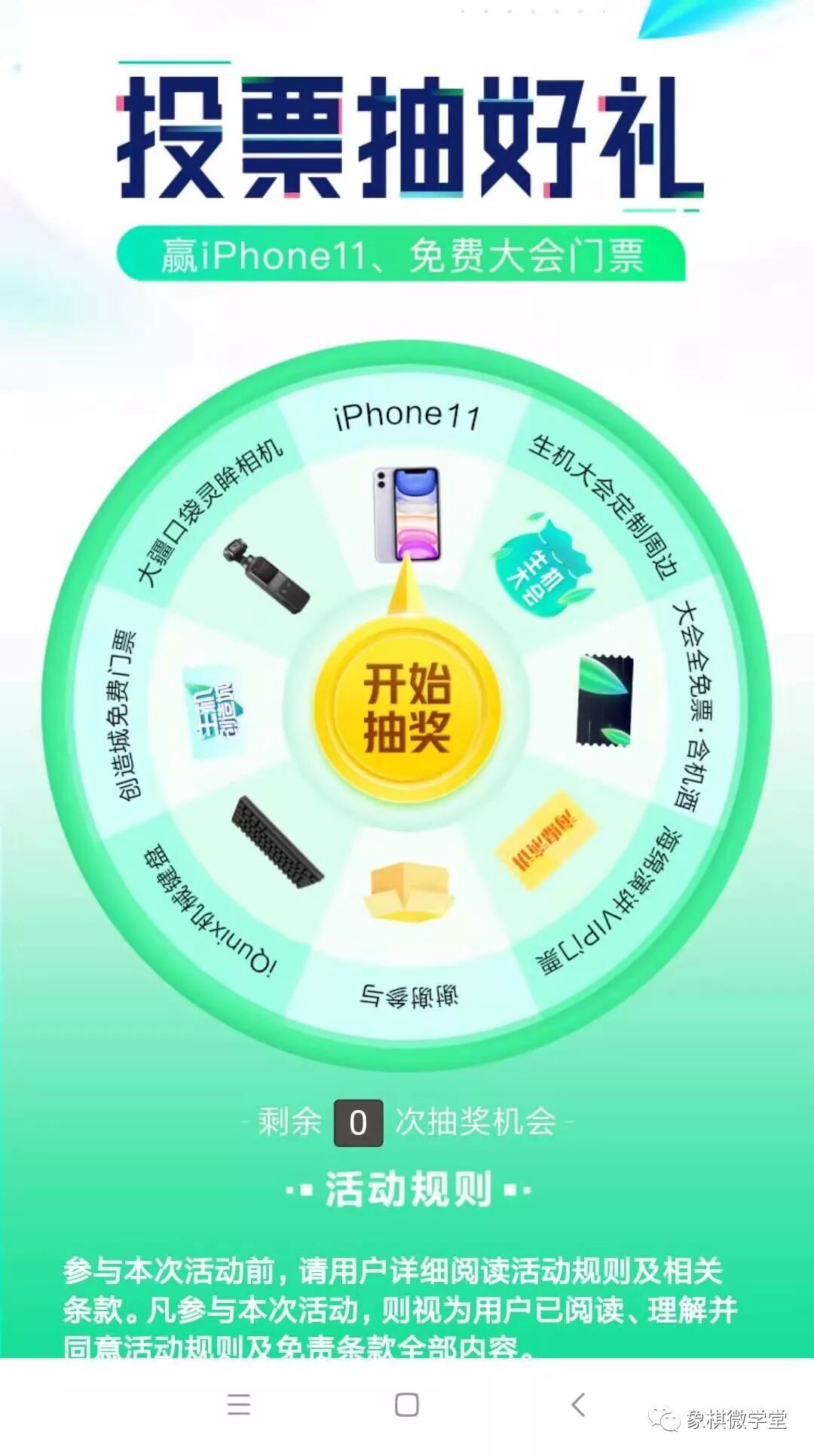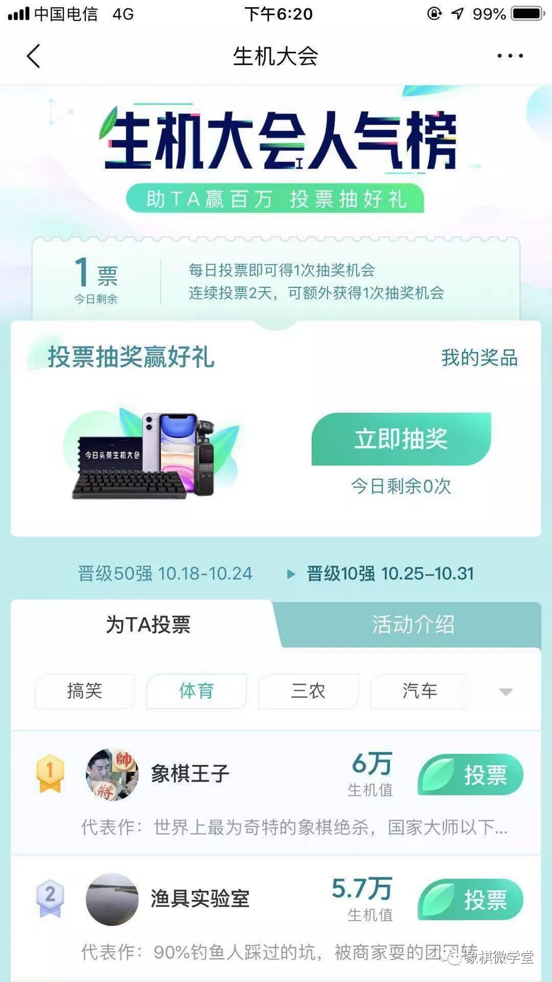 (象棋01号女神助力象棋王子甜美配音)象棋王子正在参加今日头条一年一度的生机大会人气榜,请大家为他投票,为象棋加油,投票方法:打开今日头条 (没有今日头条的话需要先下载一个。注意:不是今日头条极速版),正上方搜索象棋王子,点击象棋王子的头像,进入象棋王子头条主页,在生机大会人气榜一栏,点击右侧的为我投票,进入投票页面,今天到31号,每人每天可以连投十票。同时,投满十票,马上可以抽取万元 iPhone 11手机等奖品,祝棋友们喜中万元大奖!