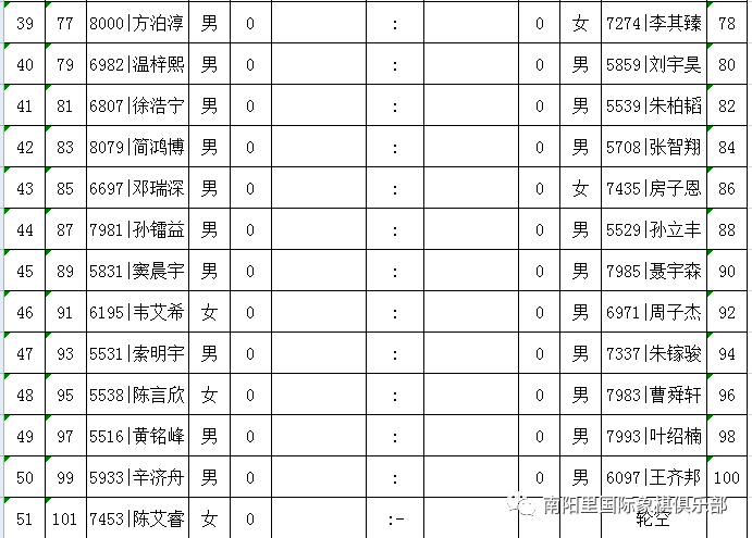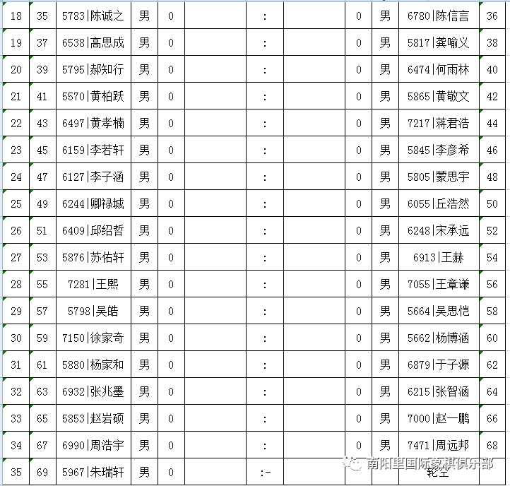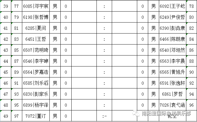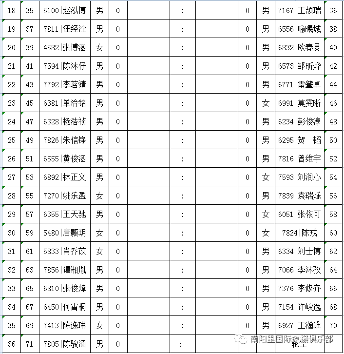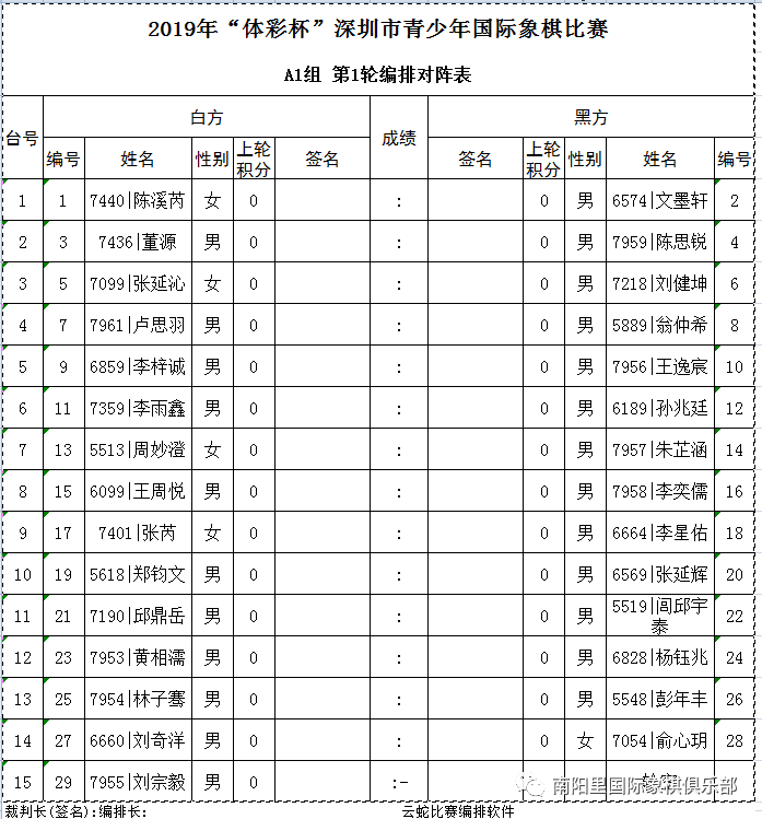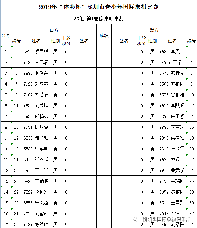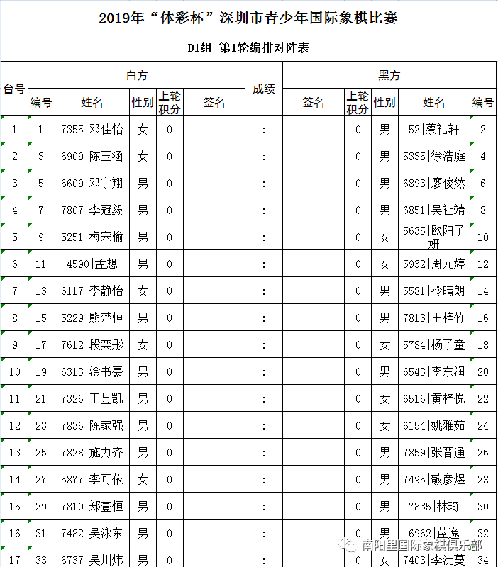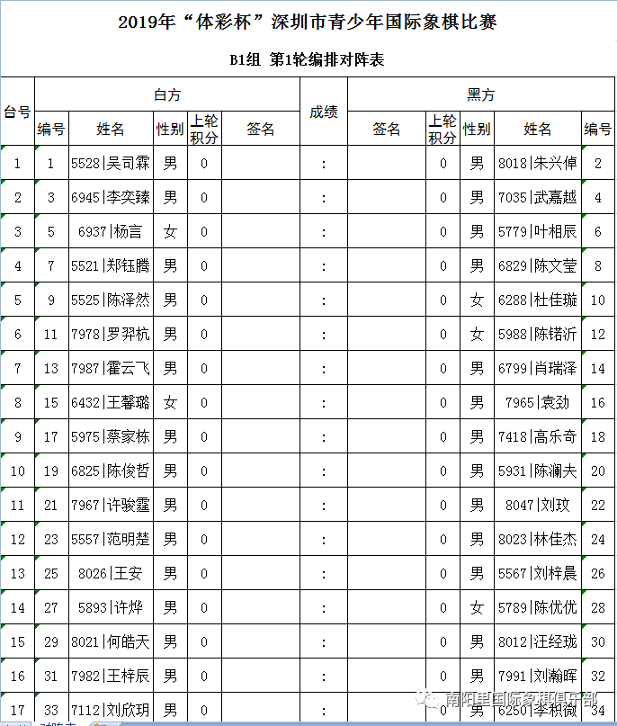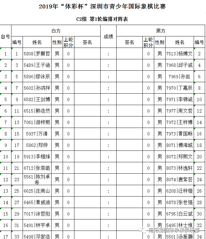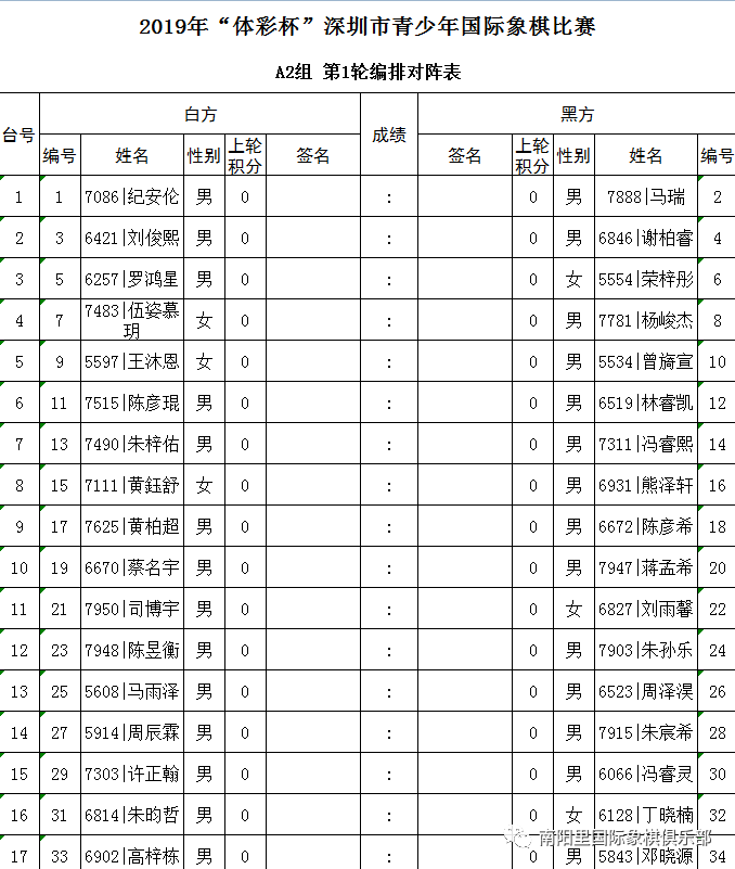 2019年“体彩杯”深圳市青少年国际象棋比赛第一轮对阵表