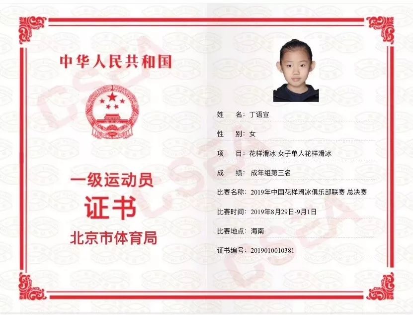 8月29日到9月1日,在海南举办的2019中国花样滑冰俱乐部联赛总决赛,女子单人花样滑冰项目中,北京博禹小花明星学员丁语宣取得成年组第三名的好成绩,荣获得国家一级运动员称号。