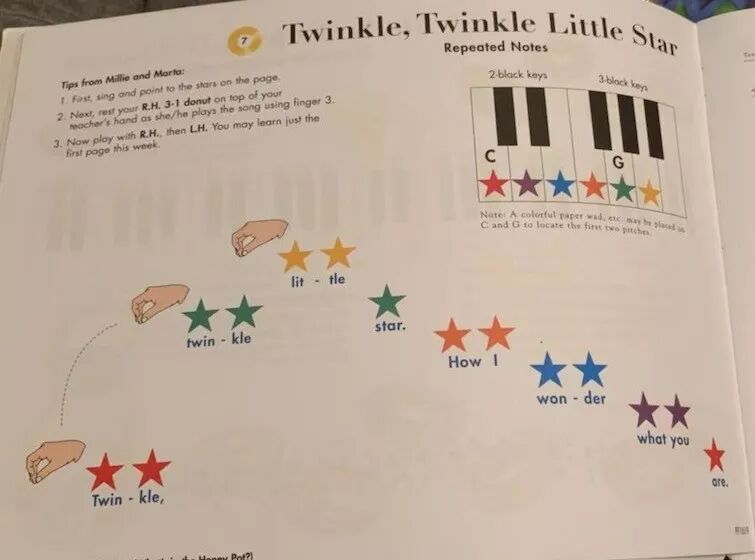 一开始孩子不懂音符的概念,就用有颜色的星星来标注键盘,而弹奏的乐曲就是孩子耳熟能详的“小星星”↓