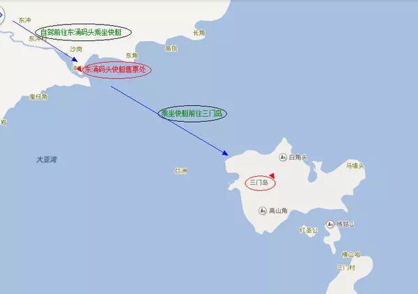 交通:从东冲、西冲、杨梅坑以及澳头港去坐快艇到三门岛,坐轮船的话大概是40-50分钟左右,坐快艇的话会快些20-30分钟。
