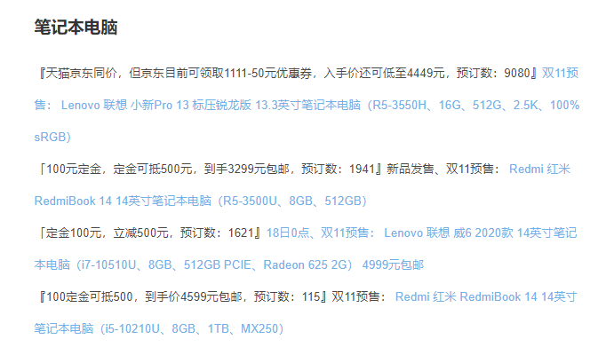 今天整理一下之前整理过的京东预售的商品,先分好类,比如笔记本电脑、音箱、洗碗机等,然后按照预定数量从上往下排,好多预定过完的,而且有好几个无货了。现在离京东付款日11月1日还有一段时间,应该还会补货吧。
