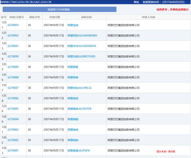 阿里巴巴注册了阿里宝宝、阿里妈妈、阿里姐姐、阿里妹妹、阿里哥哥、阿里弟弟、阿里叔叔……