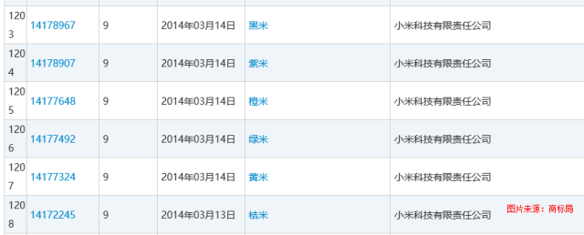 小米注册了红、黑、紫、橙、绿、黄、桔米……