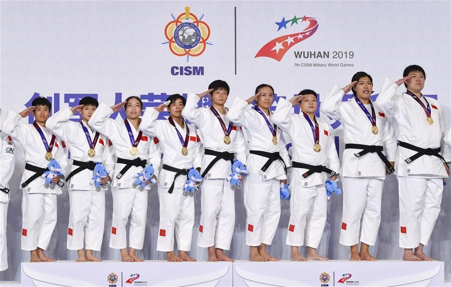 10月22日,中国队选手在颁奖仪式上。当日,在武汉进行的第七届世界军人运动会柔道项目女子团体赛中,中国队以3比0战胜法国队,获得冠军。