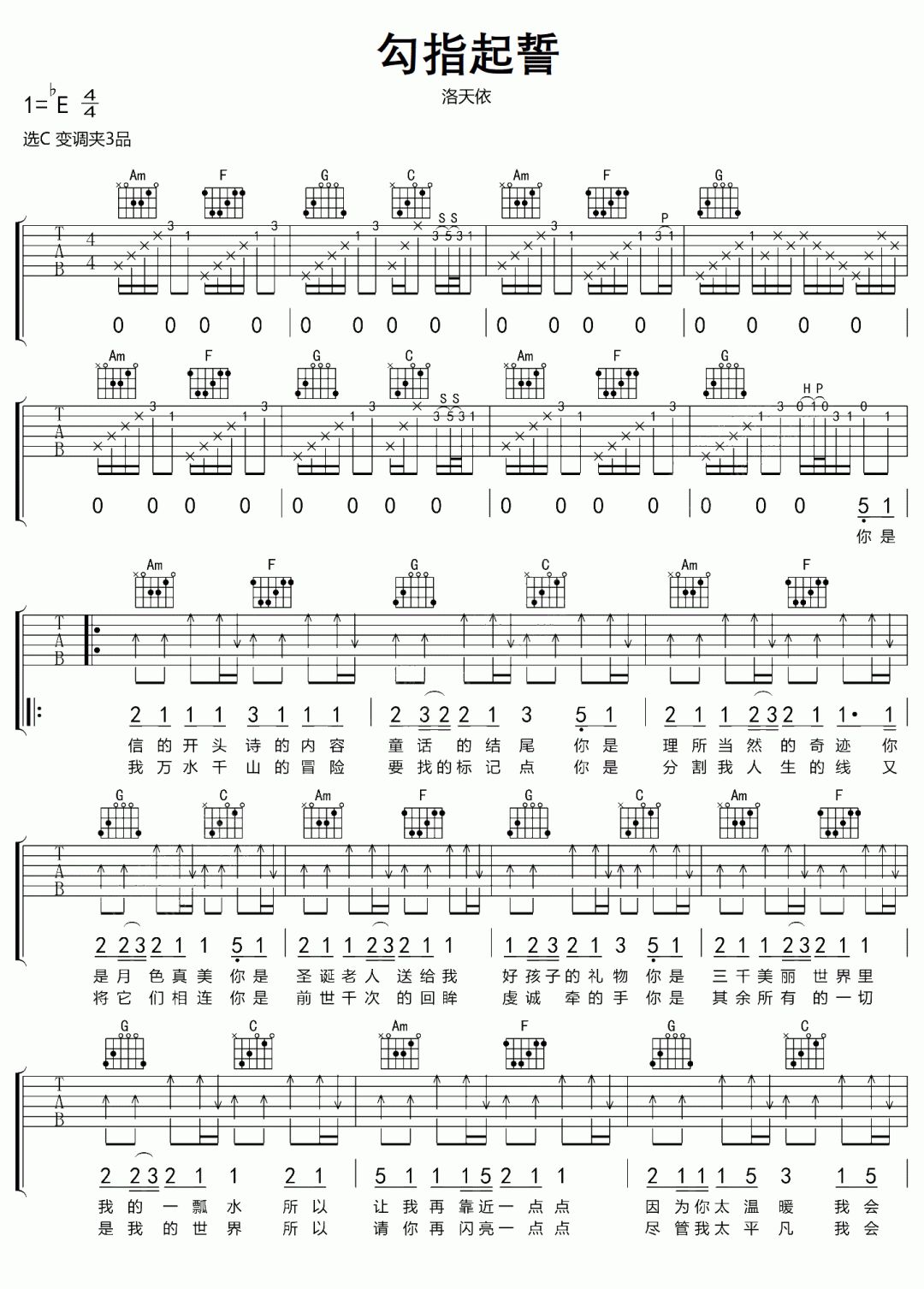 勾指起誓吉他谱,原调降E,本曲谱选C调和弦指法编配,变调夹3品。洛天依《勾指起誓》吉他谱,一共3页。吉他163收集分享。你是我生命的开始,大千世界,你是我生命中的宝贝。你和我也许是巧合,也许这是命中注定,让我们成为彼此心中.