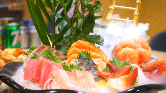 日式唐扬鸡块/金枪鱼沙拉/芝士焗蟹煲/日式照烧鸡肉串/香煎鳕鱼/奶酪芒果卷/芥末章鱼/相扑牛肉/火焰三文鱼/刺身拼盘(三文鱼、北极贝、甜虾、金枪鱼、鲷鱼、醋鲭鱼)