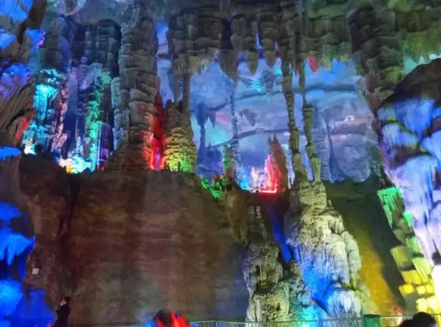 在青云潭,顺着青云潭流出的水进洞的,那时候潭中盛开着莲花,传说当年吕洞宾进洞修炼的时候,就是踩着莲花走上了使他炼成正果的“洞宾堂”。在青云潭对岸,上方一溜排开的众多天然形成,独具特色的洞穴石窟,一个个在五颜六色的彩光照射下,显得神秘莫测,亦真亦幻。其中,在宝石天庭,仰头观看,洞顶上这蛛网状的宝石天庭,恰如镶嵌在天穹的颗颗蓝宝石,闪闪烁烁,熠熠生辉,引来不少参观游客的由衷感慨。如果赶得巧的话,这些石窟里常有萤火虫飞来钻去,煞是有趣。