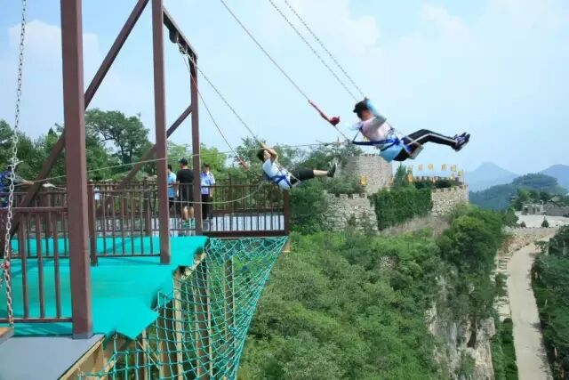 崖壁秋千落差580米,比世界第一的美国科罗拉多公园秋千还高180米!立于崖壁之上,三组高度不同的秋千最大摆动幅度可达约60度,荡出去下面便是百米深渊,来回摆动像在天空飞翔十分惊险刺激。体验崖壁秋千可以尽情享受腾云驾雾的快感,饱览群崮争辉的美景。