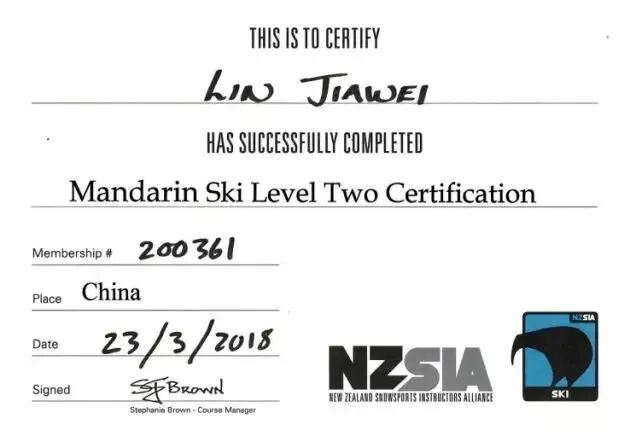 资质:同时持有国家社会体育指导员(体育)五级证书 以及新西兰双板二级、新西兰单板一级国际证书。