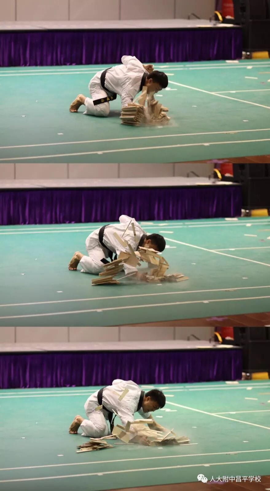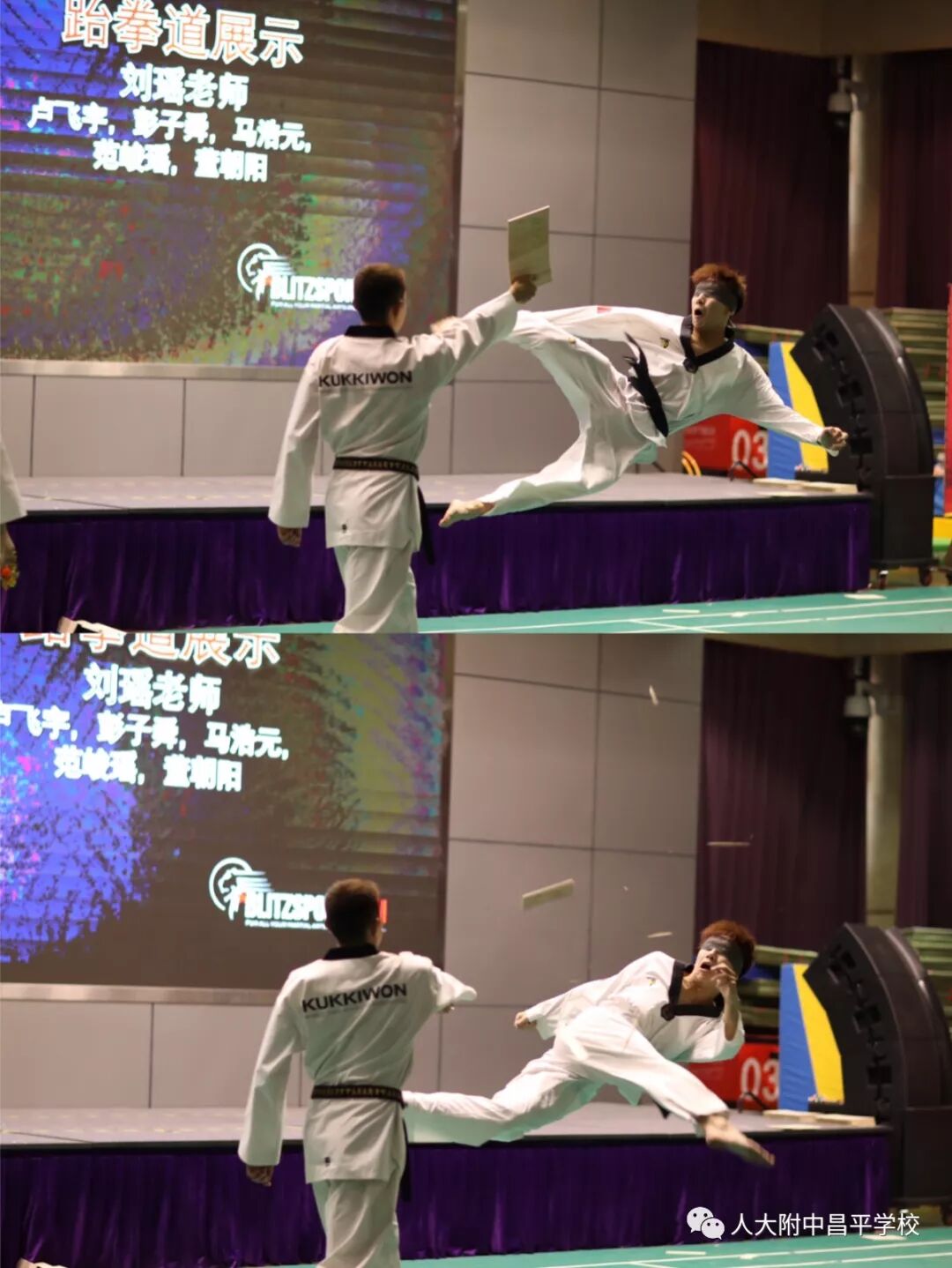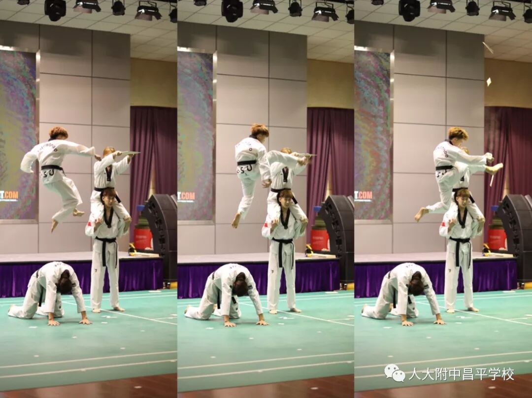 教师表演《跆拳道》。我校体育组刘瑶老师邀母校师弟师妹一起为孩子们带来了跆拳道特技表演,只见刘瑶老师一人连踢四板,团队成员还表演了各种形式的劈板和踢板,蒙眼转身540度后旋踢爆发瞬间震撼全场!近距离展现了阳刚与力量之美,孩子们的掌声和喝彩此起彼伏!