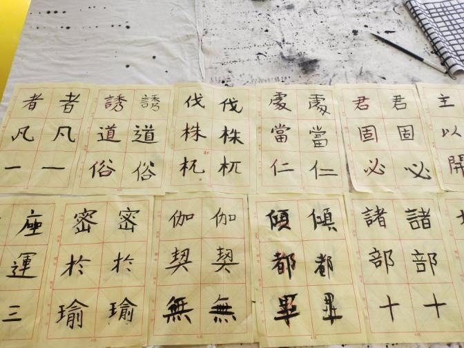 书法练习期间,陈老师挨个纠正了小朋友们的握笔姿势:头正、见平、臂开、身直、足安。通过小细节的改善,小朋友们的行坐立更加端正,书法也得到了提高。