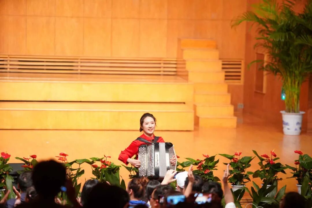 大家用鲜花和掌声向钱教授致意。同学们能近距离走近专家教授,感受手风琴的独特魅力,心情无比激动。