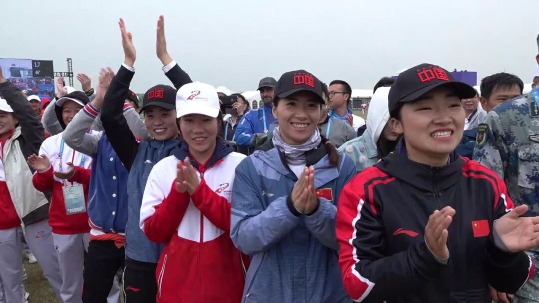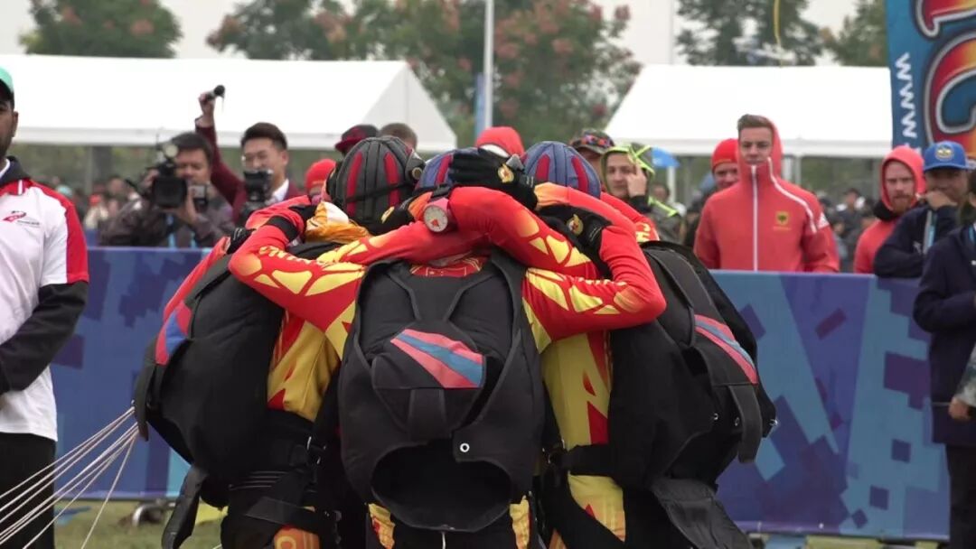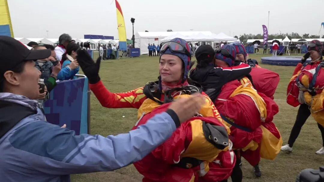 带着这股冲劲,苗梦怡和4名队友在雨中完成最后一跳,不负众望收获了女子集体定点跳伞的金牌。