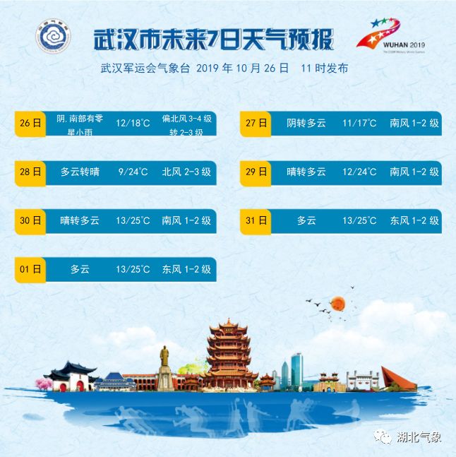 今天白天武汉市以阴天为主,高温16℃,南部有零星小雨,风速较大,对跳伞、现代五项、海军五项等户外赛事有一定影响。明天白天全市为阴天有零星小雨的天气,高温17℃。明天晚上到后天全市由多云转为晴天,高温将回升至23℃。29日后全市以晴到多云天气为主,气温较为稳定。从目前天气趋势来看,武汉体育中心明天晚上20时前后以阴天为主,气温16-17℃,风力较弱,天气对军运会闭幕式没有明显影响。