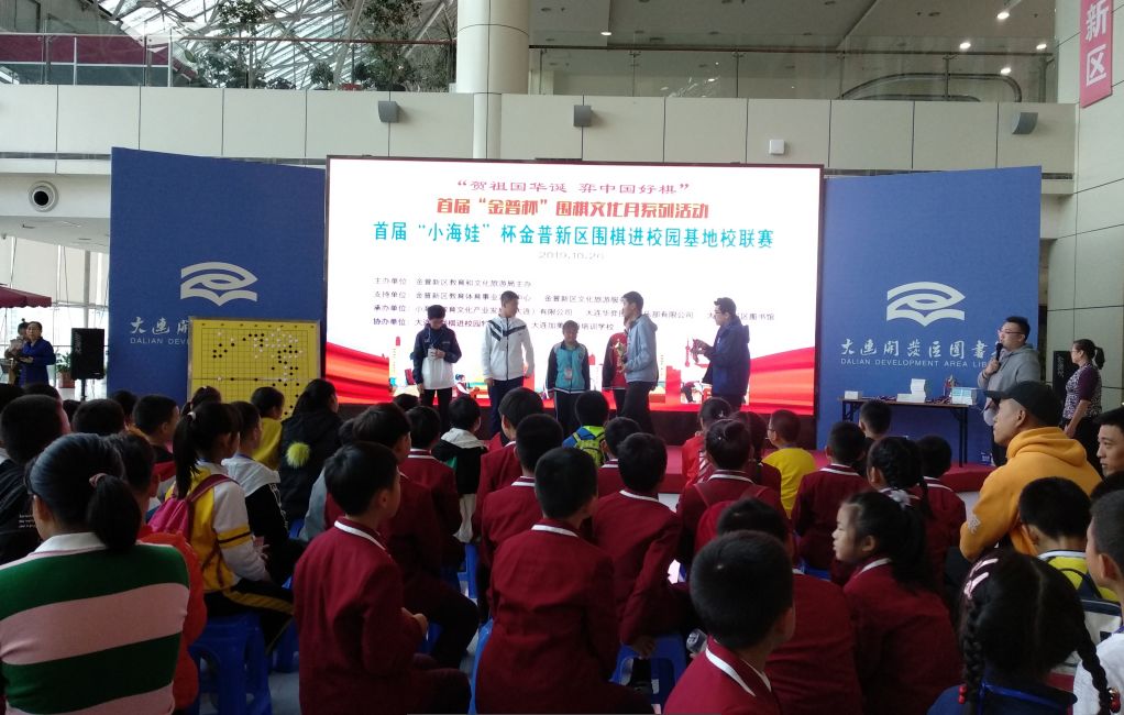 10月26日,“贺祖国华诞 弈中国好棋”首届“金普杯”围棋文化月系列活动之首届“小海娃”杯金普新区围棋进校园基地校联赛在开发区图书馆开赛。本次活动由金普新区教育和文化旅游局主办,金普新区教育体育事业发展中心,金普新区文化旅游服务中心支持,大连开发区图书馆、金普新区德育研究指导中心、大连市围棋进校园特色小学协办,小海娃文化产业发展有限公司、大连华弈围棋俱乐部有限公司、大连加美外语培训学校承办。本次比赛是“贺祖国华诞 弈中国好棋”首届“金普杯”围棋文化月(9.26-10.28)系列活动之一,共有28个参赛团队、112人参赛,是在金普新区多年围棋进校园基础上举办的首届基地校团体联赛。