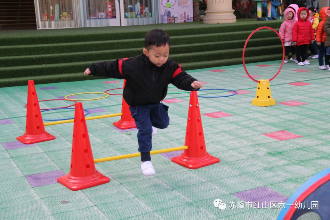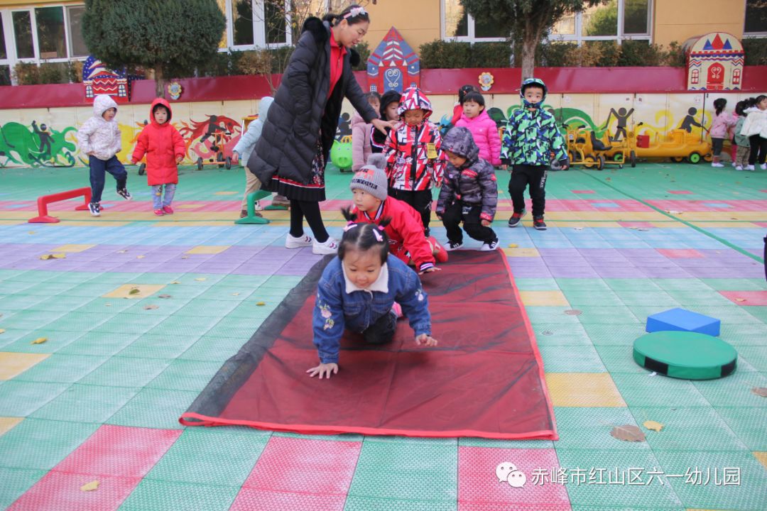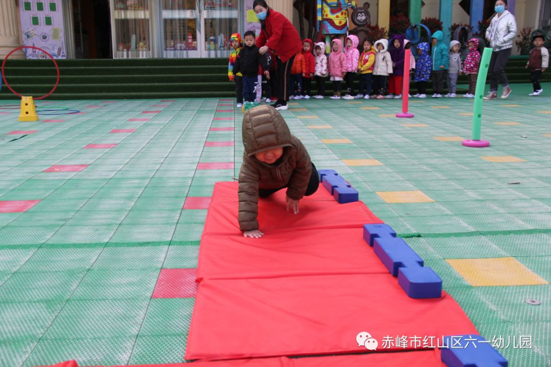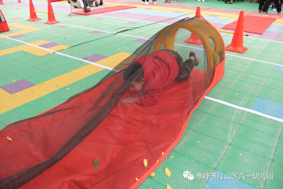 中班组老师巧妙的利用钻爬筒、爬行垫、单元砖等器械,通过不同的摆放方式,创设投掷、钻爬、平衡等项目,孩子们在老师的指令下奋力的跨过跨栏,走过平衡木,大家你追我赶好不热闹,操场上一片欢声笑语。