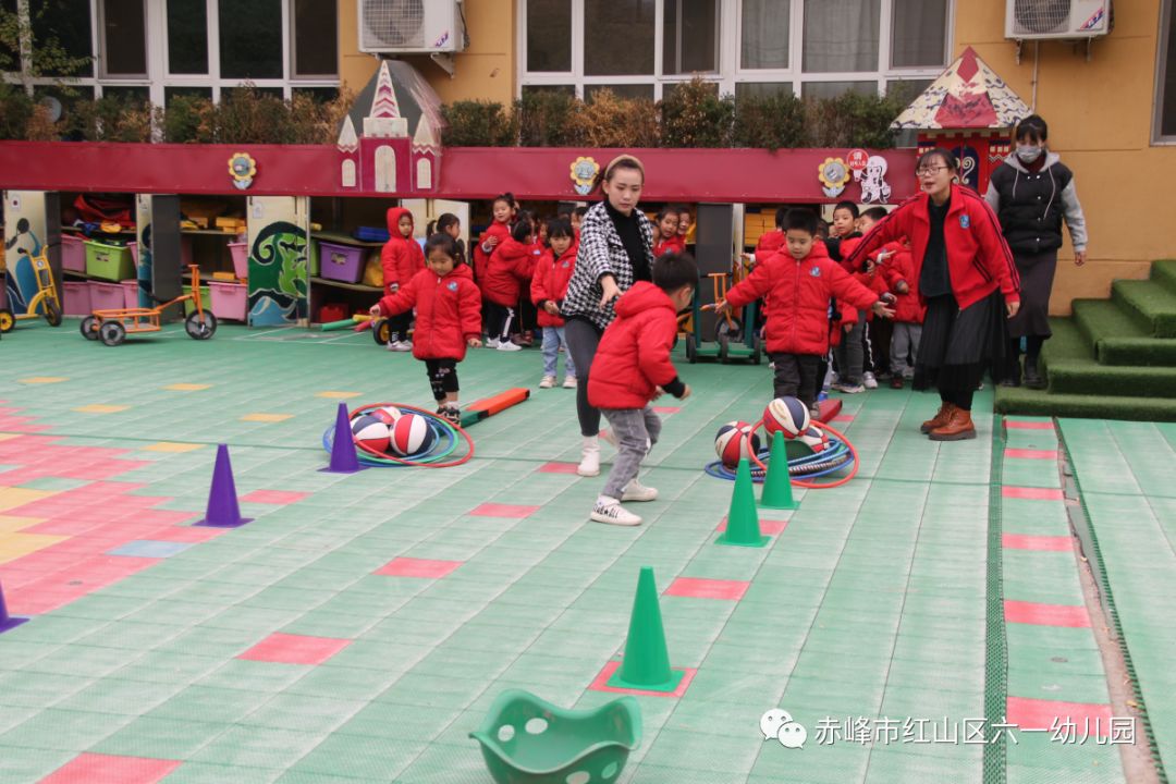 大班组老师根据《指南》中,对大班幼儿体能活动的要求,又结合幼儿年龄特点,设计的活动富有挑战性,注重规则意识和协调能力培养,把大班幼儿的合作性融入其中。有速度与灵敏性相结合的游戏“障碍跨栏”;有力量与趣味结合的游戏“趣味钻圈”;有耐力性游戏“平衡木双人运球”等,让幼儿在运动中,掌握并练习钻爬、平衡、手脚配合等多重运动技能,同时又通过一定强度的运动来促进幼儿身体机能的发展。