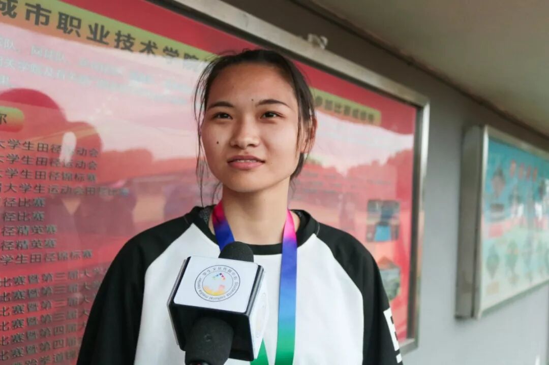 女子800米、1500米冠军 我是体训队的,当然要拿第一。但还是没达到预想速度,比我想破纪录的愿望还差一点。拿了冠军感觉还可以再跑一个三千米,争取下一次发挥得更好!