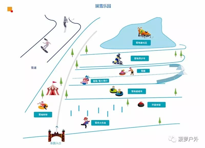 为满足单板滑雪者的需要,雪场还设有雪上单板娱乐区,以满足不同级别的滑雪爱好者的不同需求。