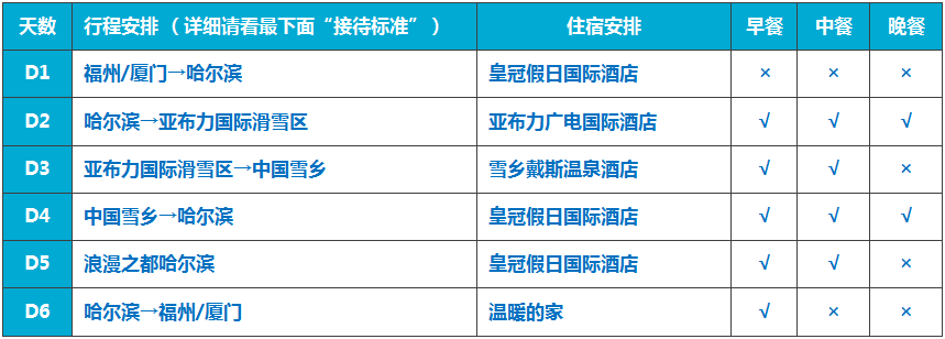 【用餐安排】全程酒店免费提供早餐,全程5早6正高端特色餐,10人一桌,不低于10菜一汤,不足10人菜品酌减,不含酒水。(雪乡、亚布力属于景区,早餐相对简单,用餐人多偶尔需要等待,行程内定制餐食,不吃不退费,敬请理解)。