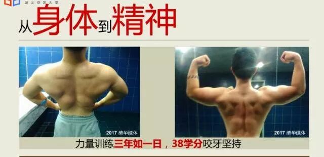 曾经的他,三千米都跑不下来,引体向上成绩为0;后来,他跑了90次阳光长跑(要求为21次),引体向上拉到满分,并成为清华健美队成员。