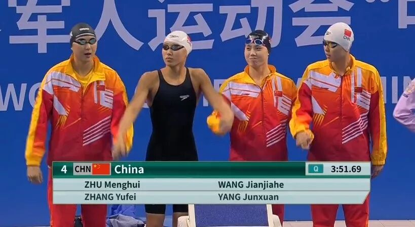 第七个项目男子4×100米自由泳接力,中国队派出何峻毅、刘绍峰、汪顺、季新杰的组合,结果强大的巴西队成功夺冠,中国队获得亚军,巴西队的3分14秒36打破了赛会纪录,拿下本次军运会游泳首金。第八个项目是女子4×100米自由泳接力,中国队派出朱梦惠、王简嘉禾、张雨霏、杨浚瑄的组合,最终中国队以3分39秒57获得冠军,并打破赛会纪录。
