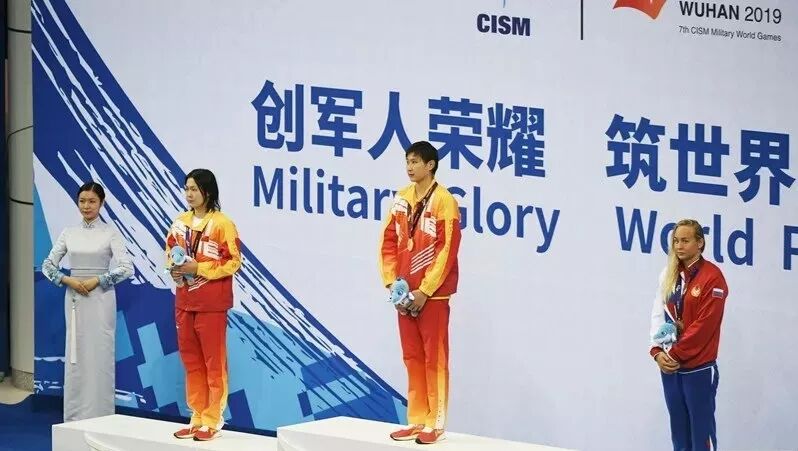 游泳池首金!中国选手王简嘉禾以4分04秒42的成绩打破国际军事体育理事会记录!另一名中国队选手武汉姑娘张雨涵以4分07秒29的成绩获得亚军。
