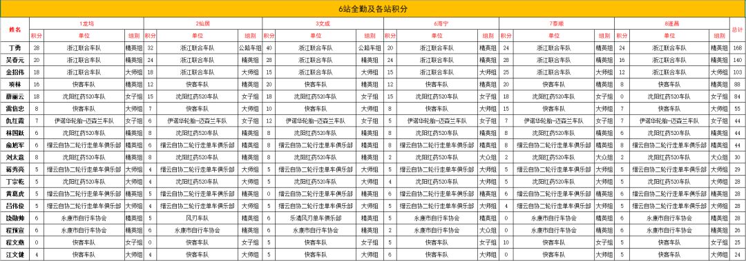 2019浙江自行车联赛6站全勤运动员及积分榜