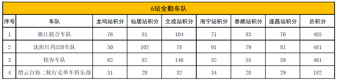 2019浙江自行车联赛6站全勤车队分榜