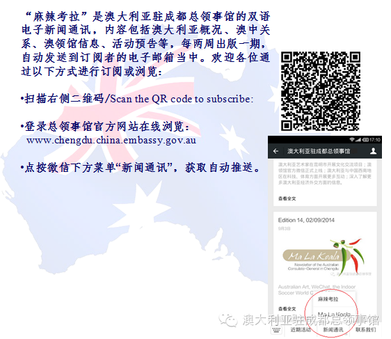 9月23日,阿德莱德港澳式橄榄球俱乐部在成都推出了“力量澳式橄榄球”项目。在澳中理事会拨款计划的资助下,“力量澳式橄榄球”将为研修“南澳大利亚的教育证书” 的成都高中生教授关于澳式橄榄球的规则。副总领事彭善明在项目开幕式致辞。