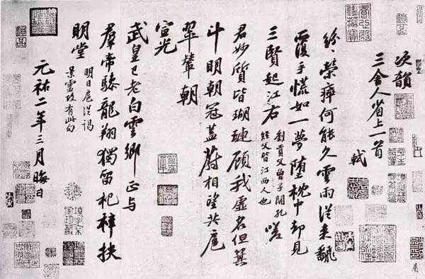 章法的布局美又在于它能符合自然美的法则,妙在各得其所。苏东坡的《黄州寒食诗帖》通篇结构、大小、长短、疏密等变化迷离,在有意无意之中,流露出一种不事雕琢的意趣。精神兴会,奔赴腕底,使整幅作品表现出一种豪放雄浑的气势。反之,过于工整齐平而无变化,杂乱无章而乏气韵,以及一些过于窒塞局促,或过于疏远神散的章法,往往就不能给人以一种美的享受。