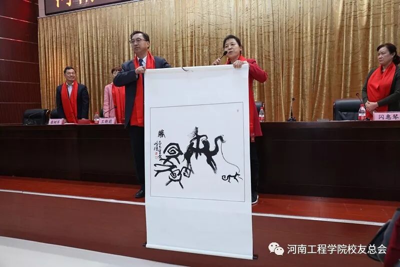 向校友代表回赠校友总会常务副会长耿广智的书法作品