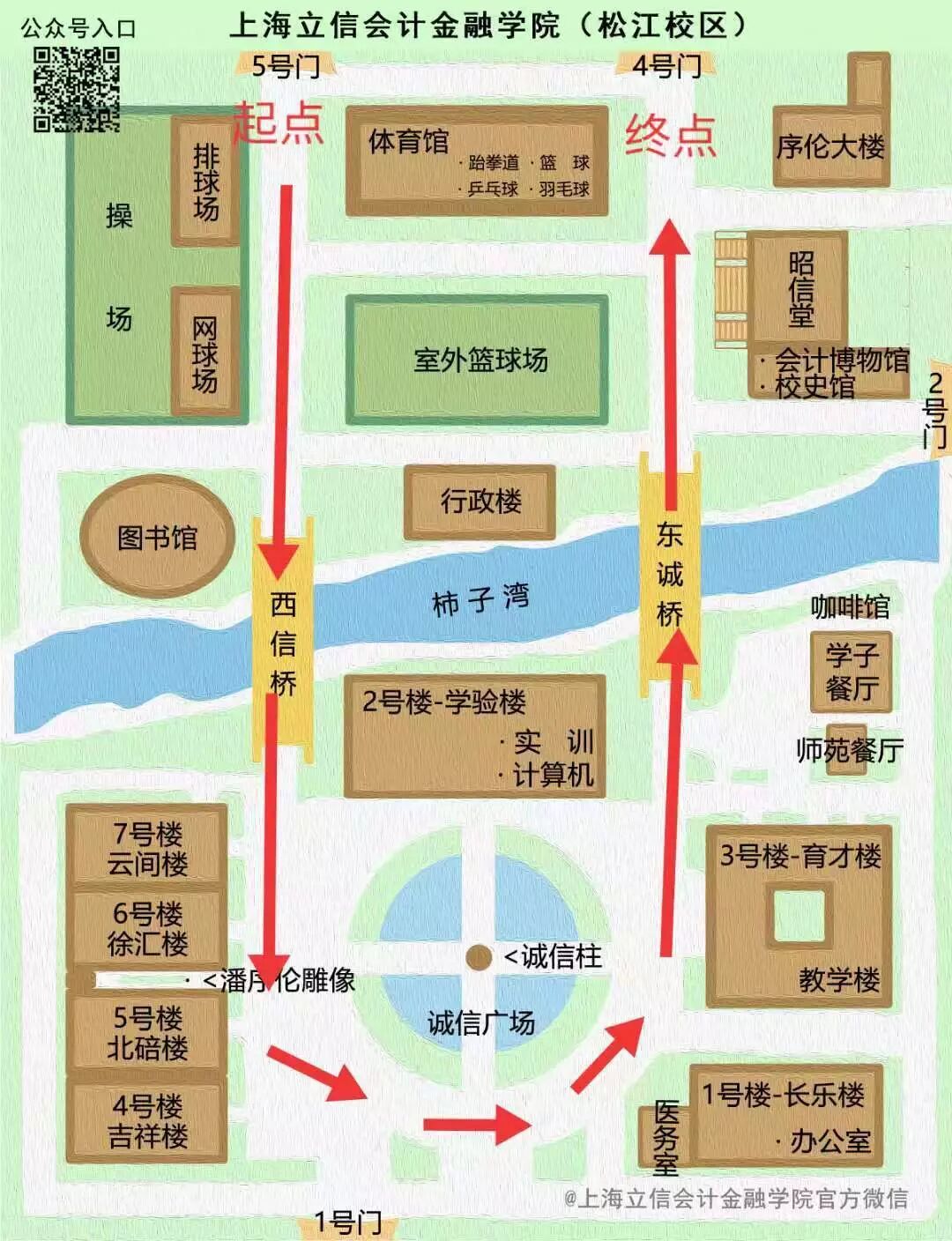 上海商学院上海商学院为了方便同学设计了从宿舍楼到操场的晨跑路线,在起点与终点处设立打卡点,希望通过晨跑为学生带来精力充沛的一天。