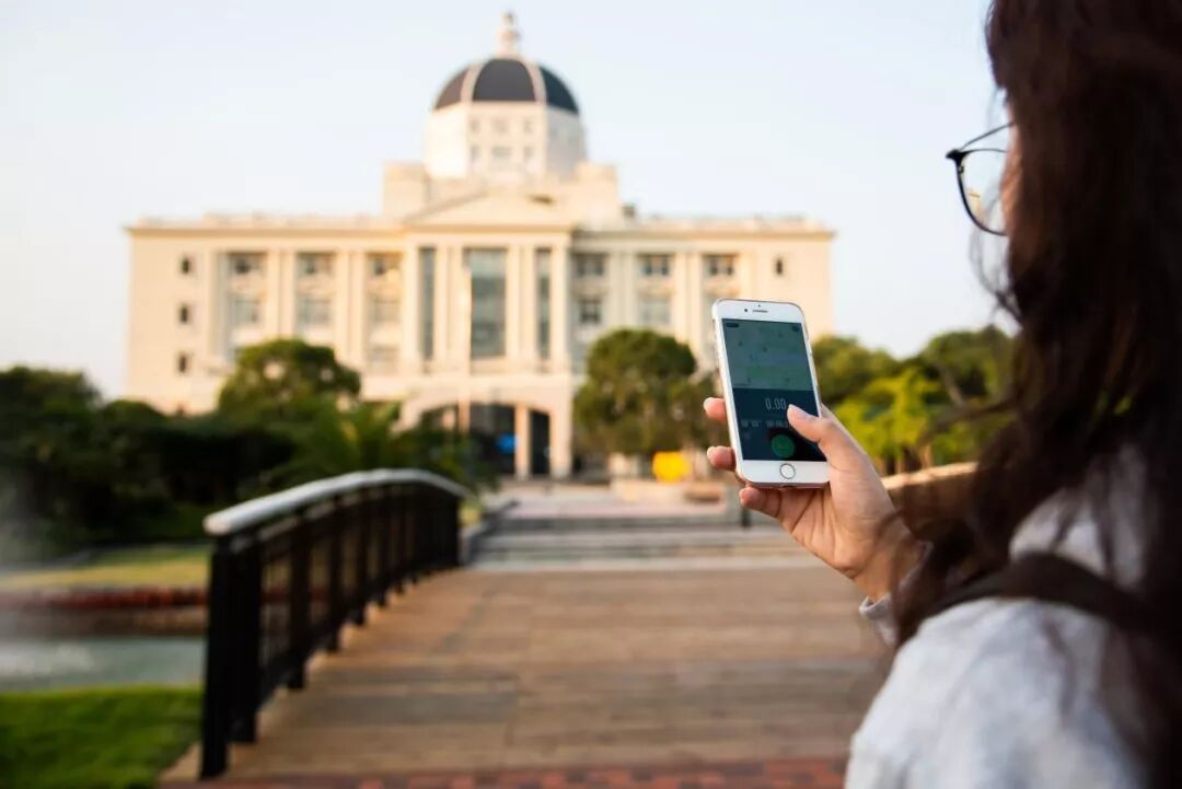 华东政法大学学校学生使用手机APP完成日常跑步训练。打开APP,选择“训练跑步”,多个绿色和红色的“打卡点”便跃然屏幕之上,这些点均在华政校园范围内,跑步者用手机蓝牙进行定位感应,在15分钟内完成1.5千米、并经过了两个绿点和一个红点即算单次达标。