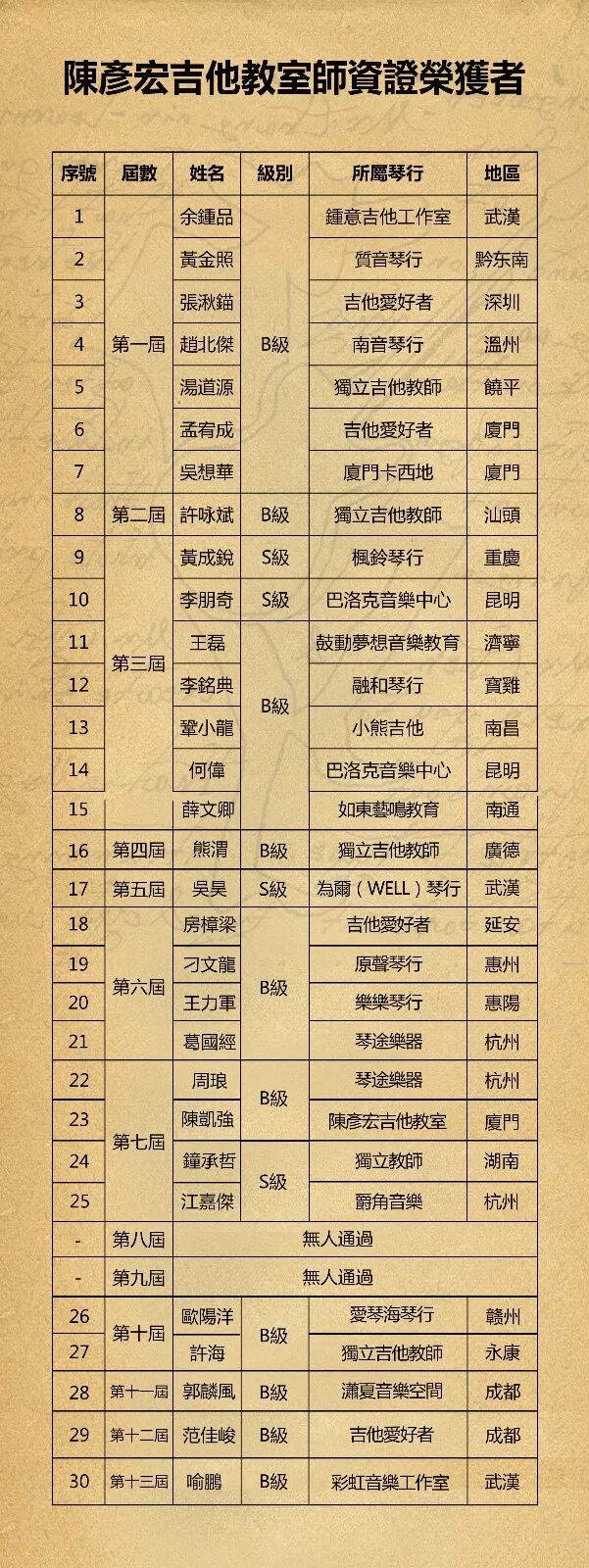 ***B級、S级通过者,可在陈彥宏吉他教室任职;P级通过者,可在陈彥宏吉他学院聘任主修教授***