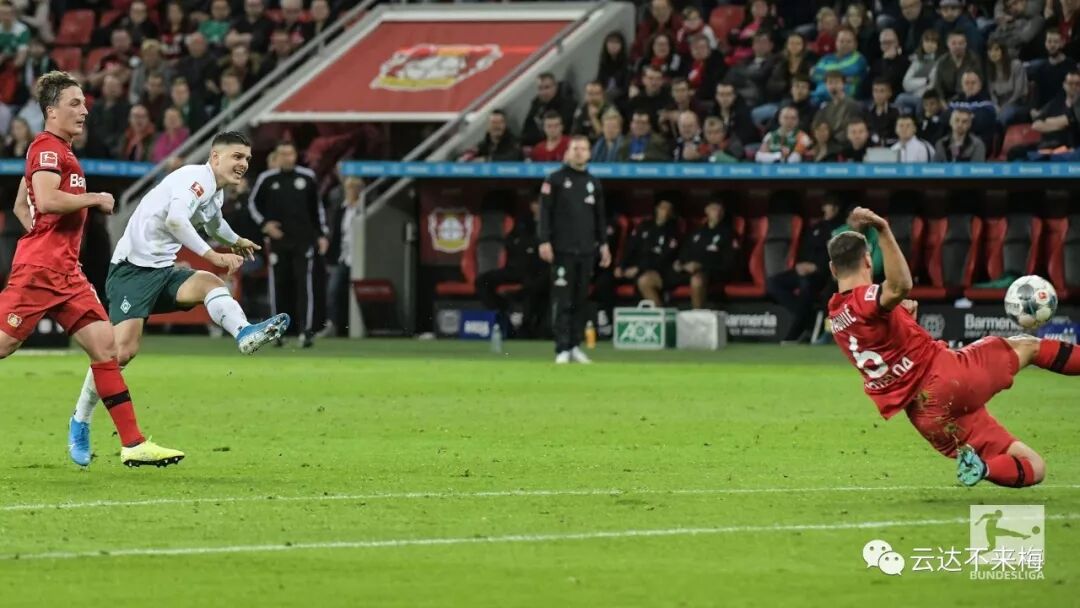 第27分钟,药厂再次通过角球将球打进,好在这一次前点后蹭的瞬间,进球的弗兰德处在了越位位置,进球无效,不莱梅逃过一劫。第30分钟,不莱梅打出漂亮反击,先是沙欣马赛回旋,巧妙地摆脱了对方的高压逼抢后,分球给拉希察,后者利用速度和变向过掉了补防的塔,传中给中路的萨金特。萨金特跟进一脚劲射,可惜球稍稍偏出左侧门柱,不莱梅错失扳平良机。