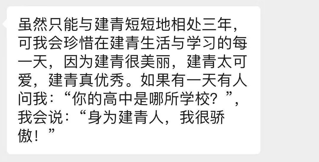 我始终觉得能遇见、能认识的人都是有缘的人,就像在高一遇见了和蔼的英语课任老师和化学课周老师,开朗大方的生物课胡老师,还有带领着校舞舞蹈队、为建青屡次获得荣誉的艺术课陶老师;而在高二,我又与善解人意的英语课薛老师相遇,与干练的黎老师相遇