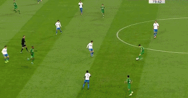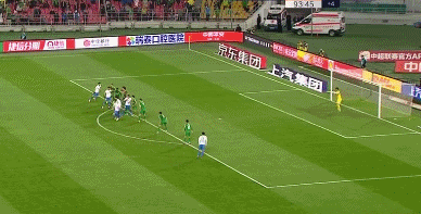 第9分钟,国安获得右侧角球机会,球传到禁区内,张玉宁前点甩头攻门,皮球击中横梁弹出。